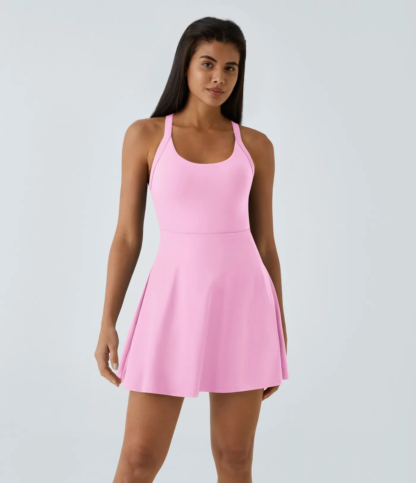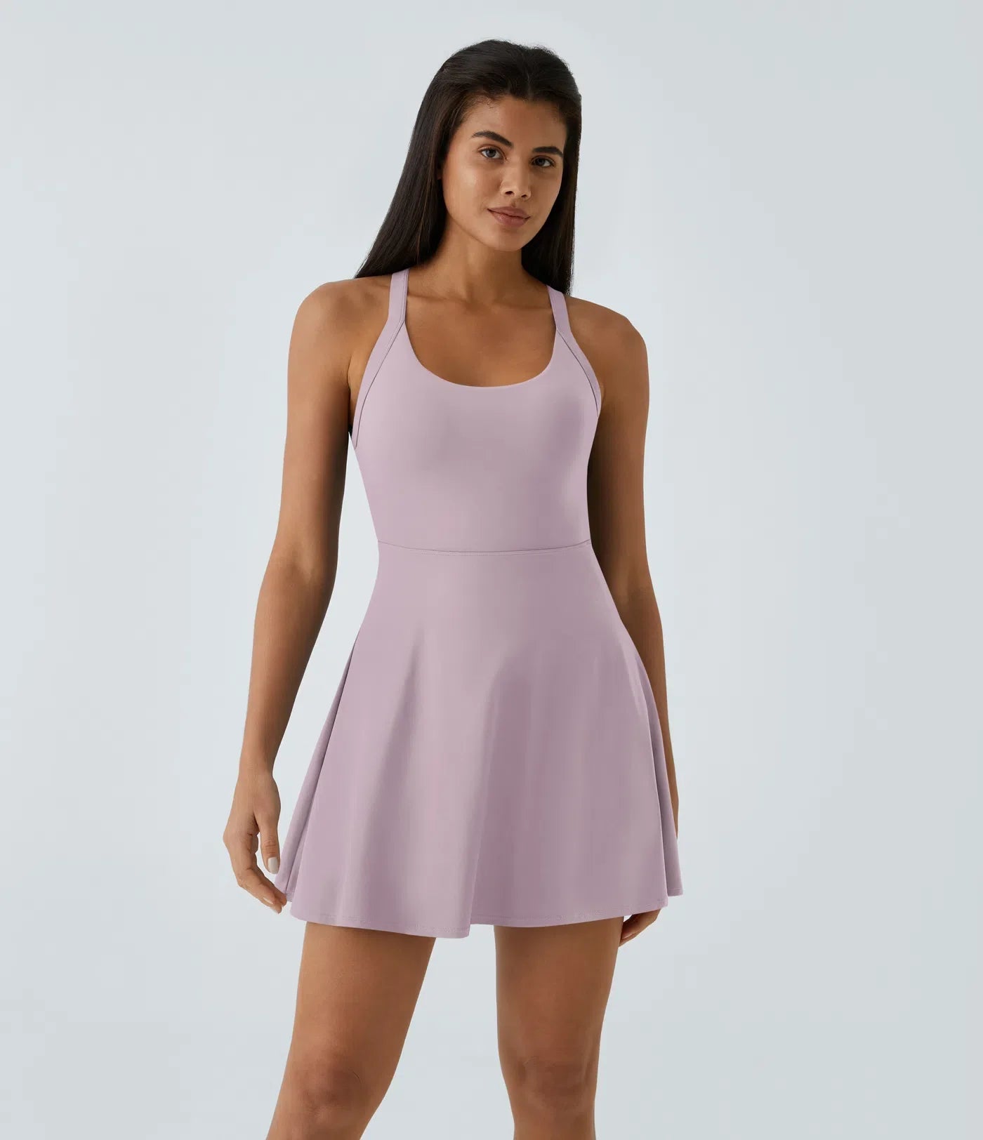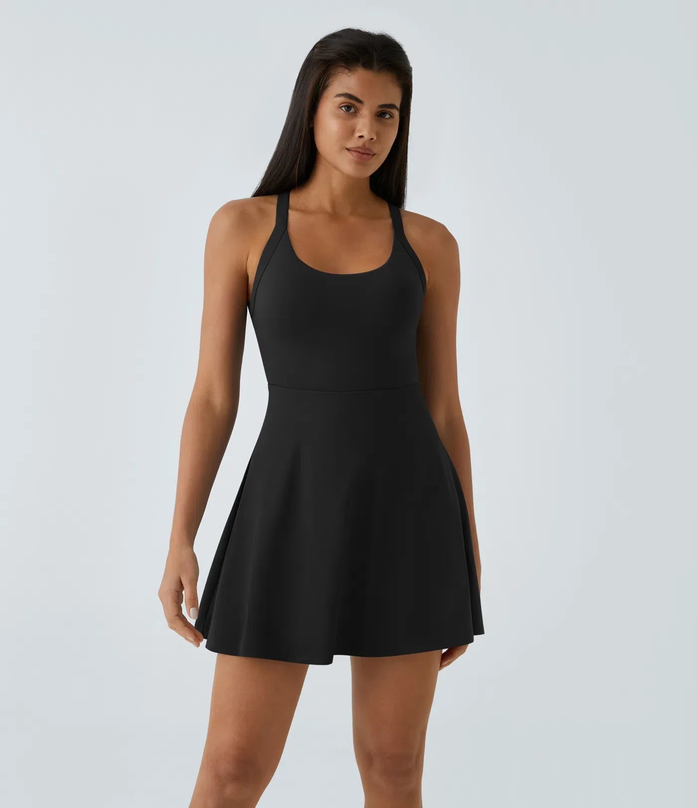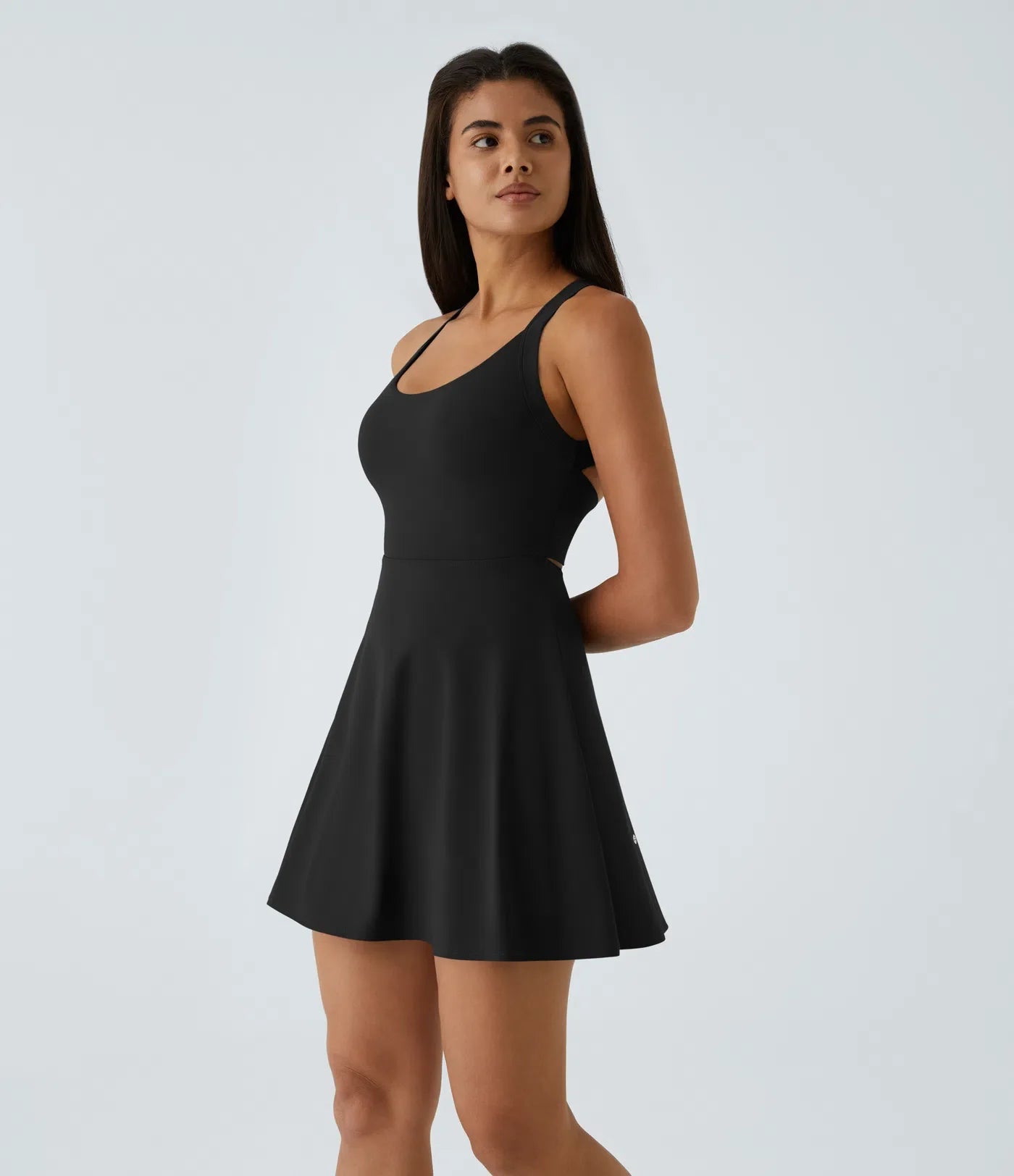 The athletic dress with shorts for women features cut out twisted back design with adjustable straps, detachable buckle design and a figure-hugging fit, what's not to love?